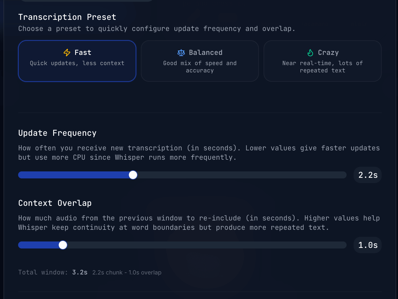 Fine tune whisper parameters and response times or try the different presets to find the perfect balance for your needs.